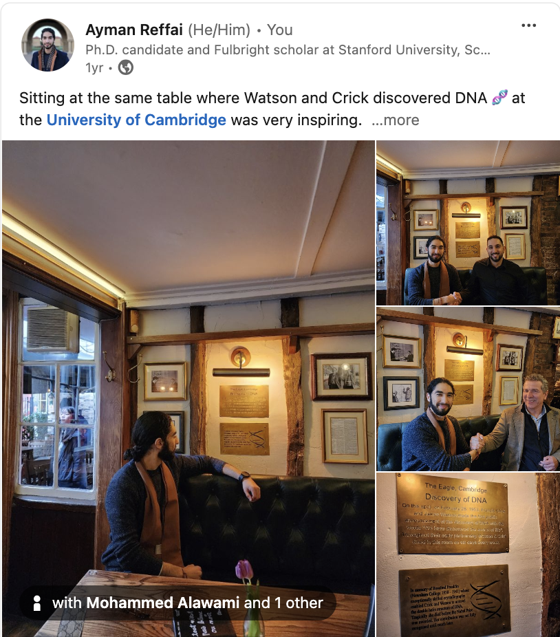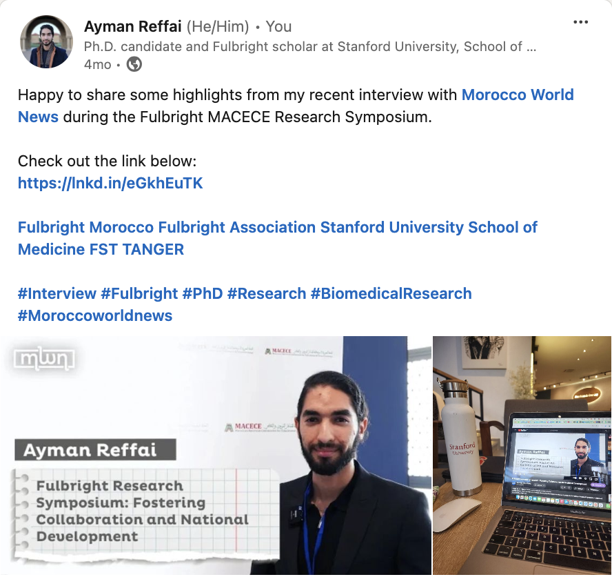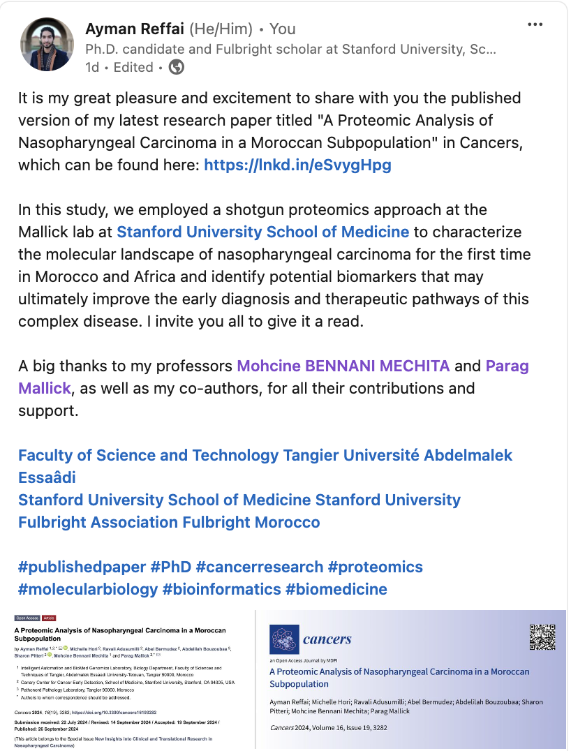 Ayman was accepted into the prestigious Fulbright program and would become the FIRST Fulbrighter from Morocco to study at Stanford. His work here created a proteomic foundation for nasopharyngeal carcinoma. I'm excited about how that foundation will be extended in coming years.